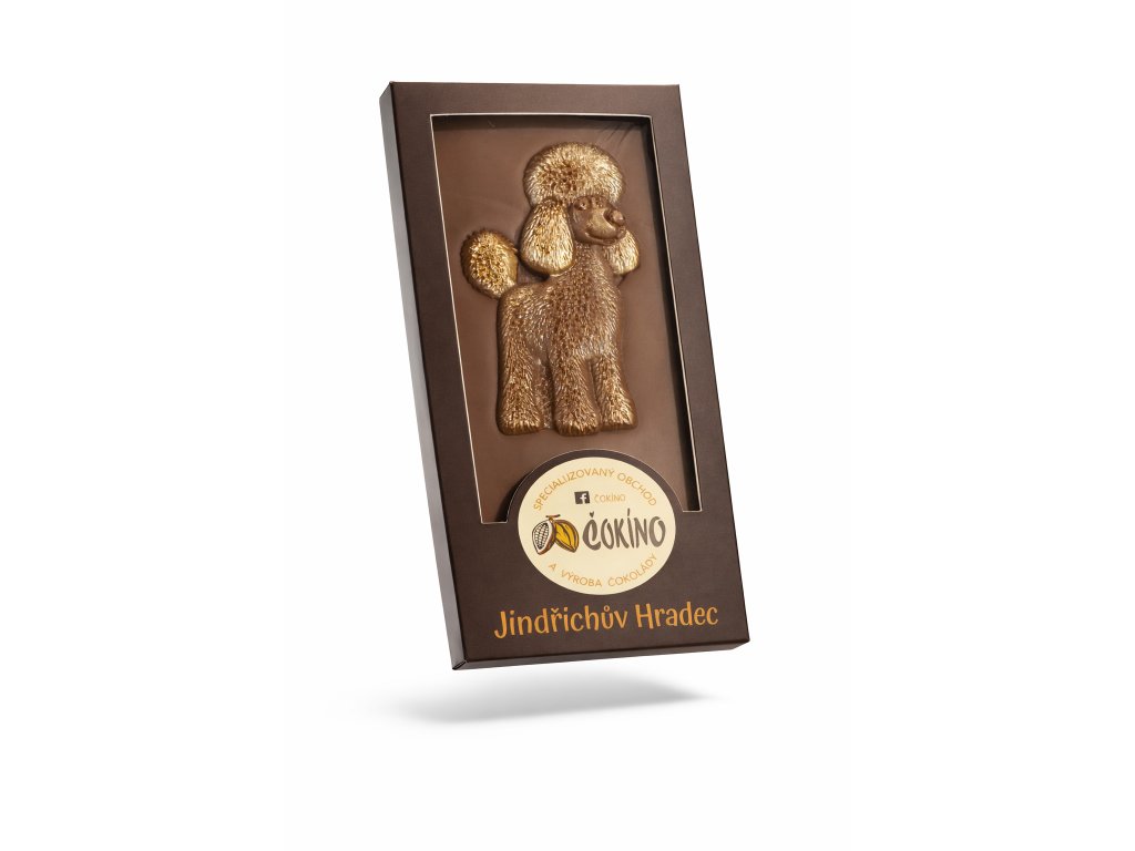 Mléčná čokoláda 35% s pudlem. Vyrobeno z prémiové francouzské čokolády od známého výrobce Michael Cluizel.