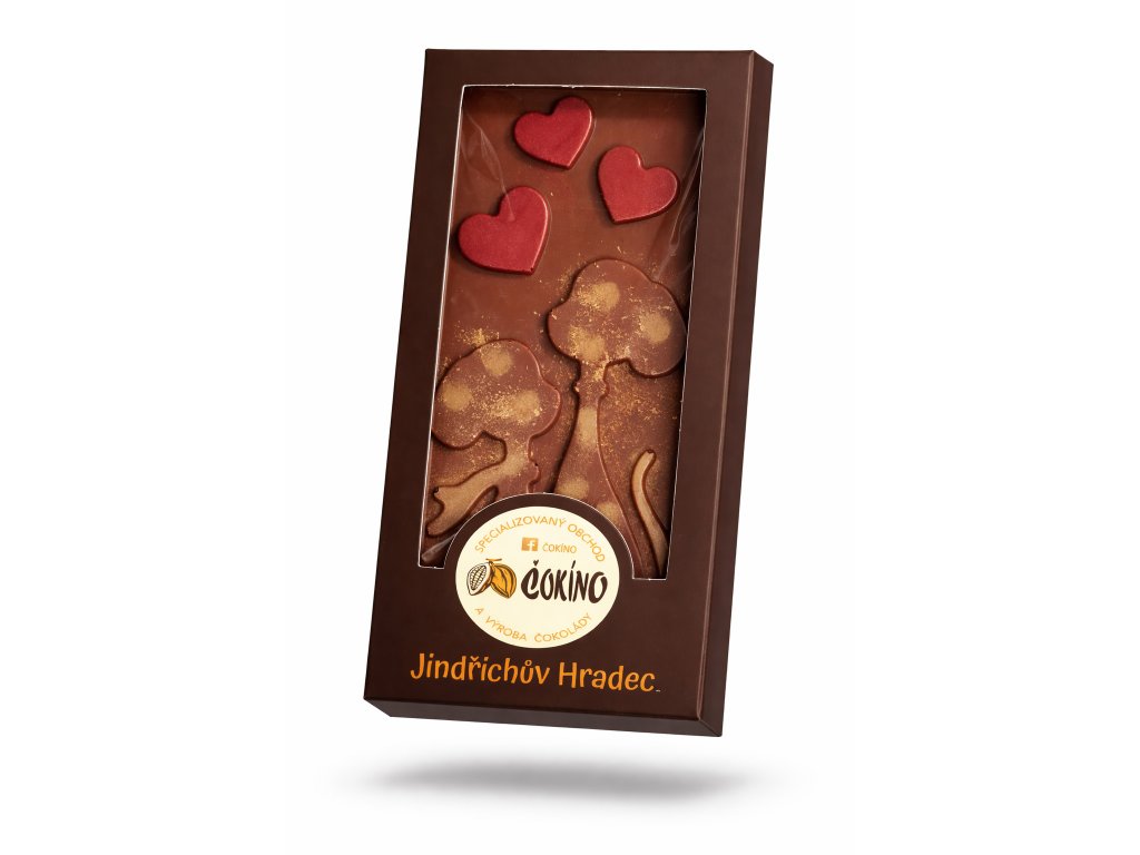 Mléčná čokoláda 35% se srdíčky a postavičkami. Vyrobeno z prémiové francouzské čokolády od známého výrobce Michael Cluizel.
